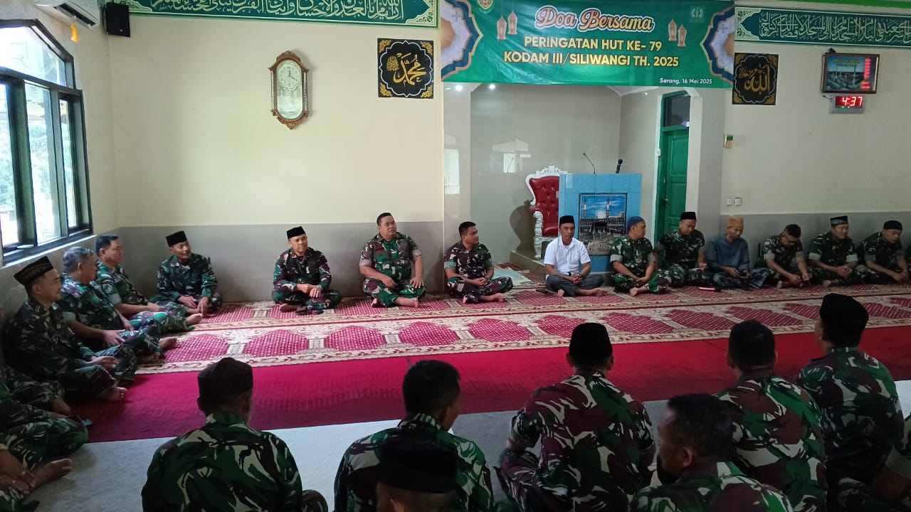 Kota Serang, – (BTP) – Dalam rangka menyambut Hari Ulang Tahun (HUT) Ke-79 Kodam III/Siliwangi, Kodim 0602/Serang menggelar kegiatan doa bersama yang diikuti oleh seluruh prajurit dan Pegawai Negeri Sipil (PNS), bertempat di Masjid Al Aqso Makodim 0602/Serang, Kecamatan Cipocok Jaya, Kota Serang, Provinsi Banten, Jumat (16/05/2025).
