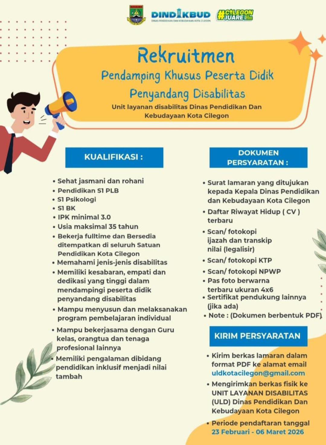 Melalui Unit Layanan Disabilitas (ULD), Dindikbud resmi membuka rekrutmen tenaga layanan disabilitas tahun 2026 guna memperkuat pendampingan serta layanan profesional bagi peserta didik berkebutuhan khusus di seluruh satuan pendidikan Kota Cilegon.
